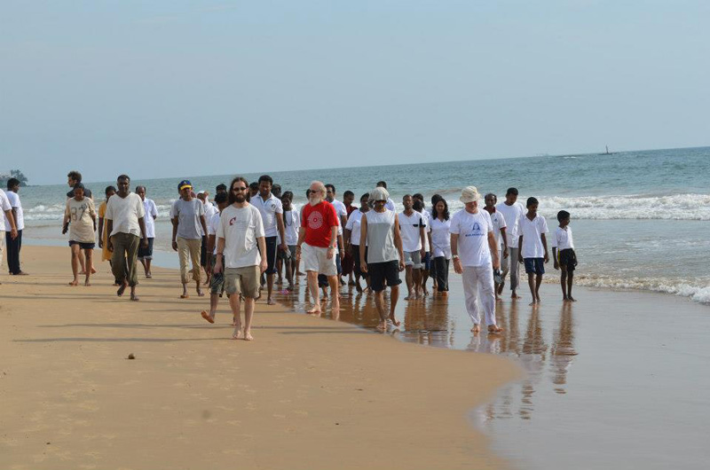 M. G. Satchidananda and 48 participants of a Kriya Yoga 2nd initiation and Silence retreat during a beach walk in front of the Colombo, Sri Lanka ashram of Babaj’s Kriya Yoga Order of Acharyas Trust, March 9, 2013